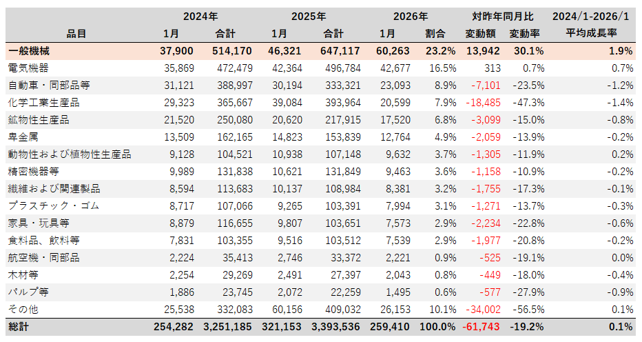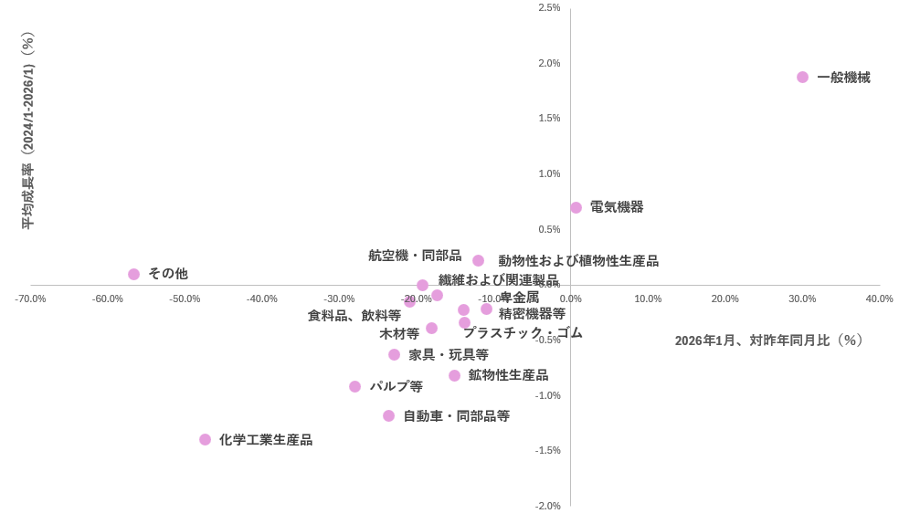 • 一般機械が2024年1月~2026年1月の平均成長率で1.9%と継続した増加傾向