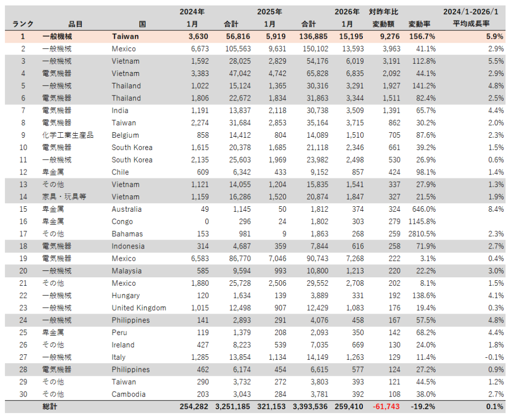 2026年1月と2025年1月の対昨年同時期変動で、品目別X国別の増加トップ30をみると、