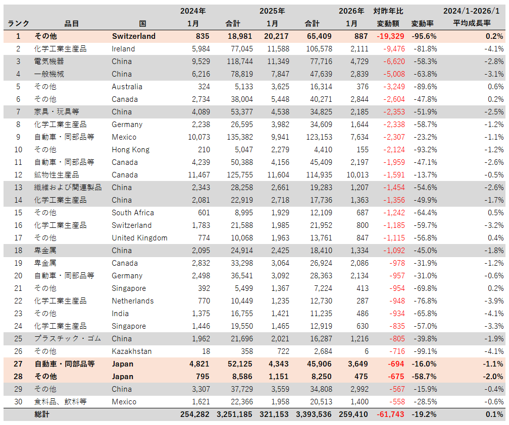2026年1月と2025年1月の対昨年同時期変動で、品目別X国別の減少トップ30をみると、