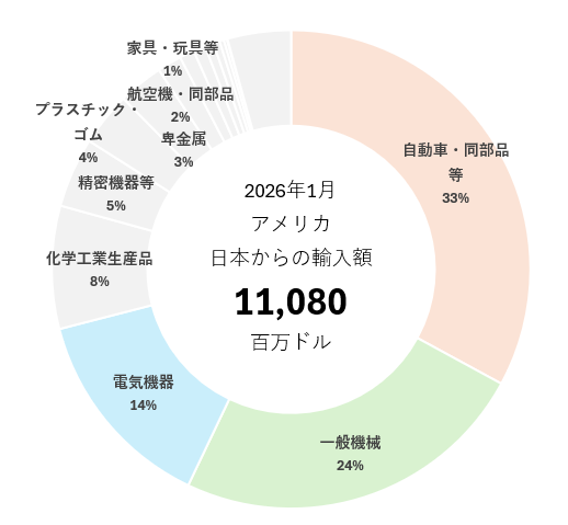 2026年1月におけるアメリカの日本からの輸入額(110億ドル)の内訳として、