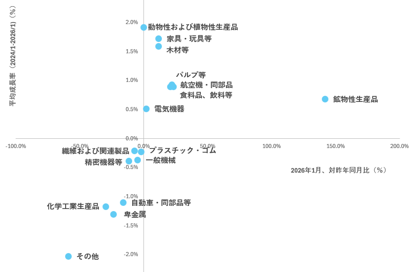 アメリカの日本からの輸入額 横軸に2026年1月、対昨年同月比(%)、縦軸に平均成長率(2024/1-2026/1)(%)をとった散布図
