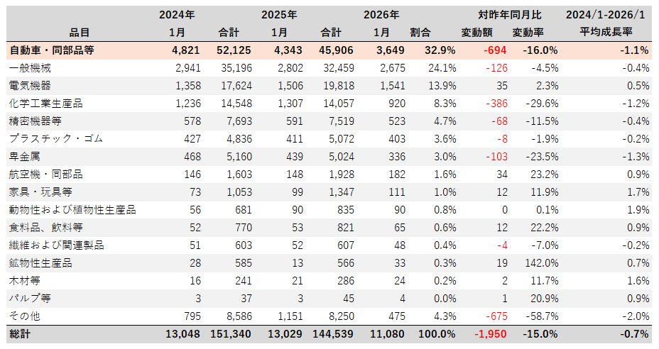 • 一方、自動車・部品では2024年1月~2026年1月の平均成長率でマイナス1.2%と継続した減少傾向