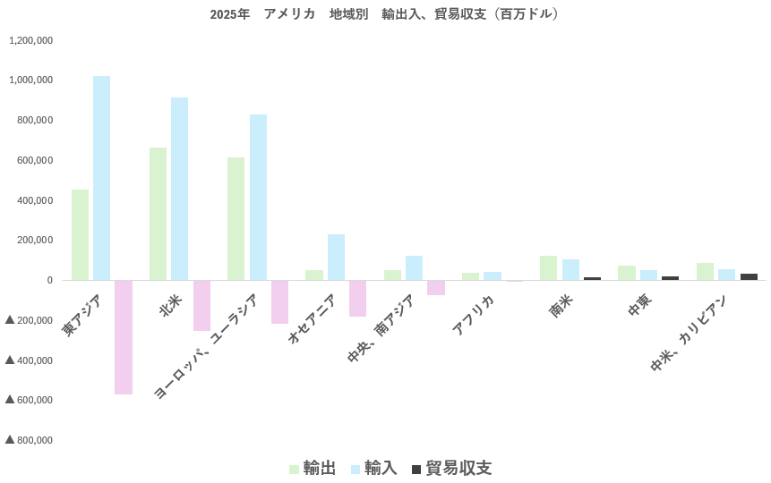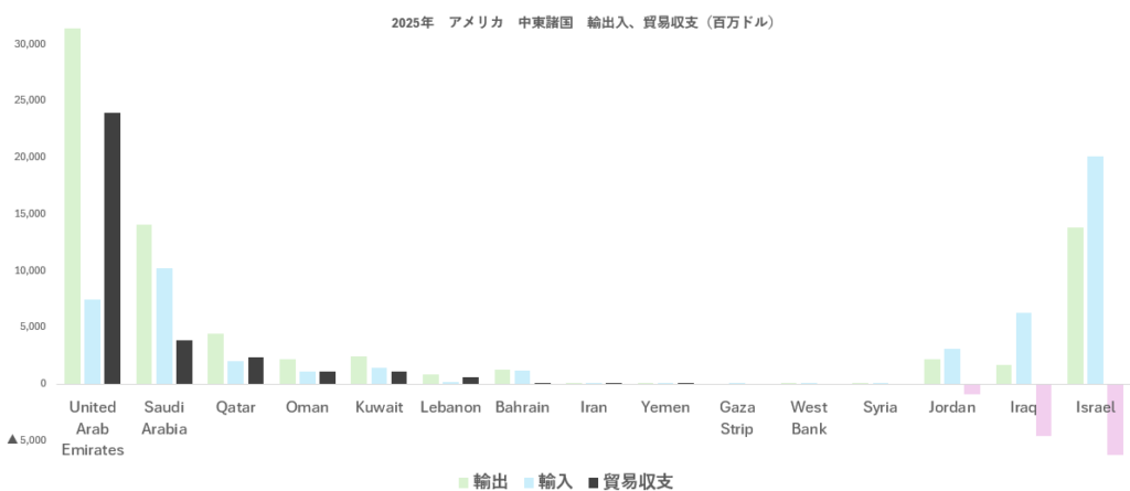 2025年 アメリカ 中東諸国との輸出入、貿易収支(百万ドル)