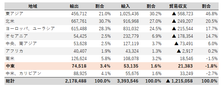- 2025年におけるアメリカの中東地域への輸出額は745億ドル(全輸出額の3.4%)