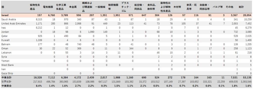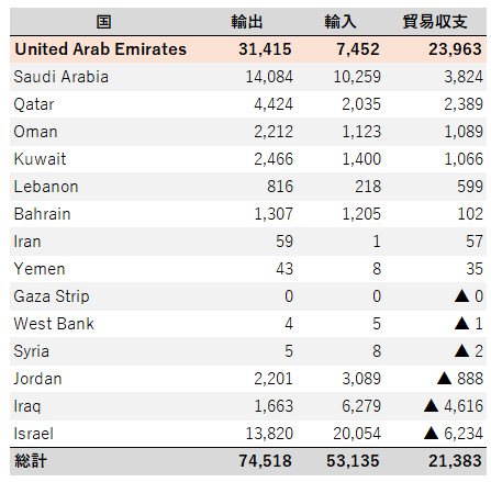 - アラブ首長国連邦向けの一般機械(51億ドル)、航空機(57億ドル)、自動車(41億ドル)の輸出が大きい