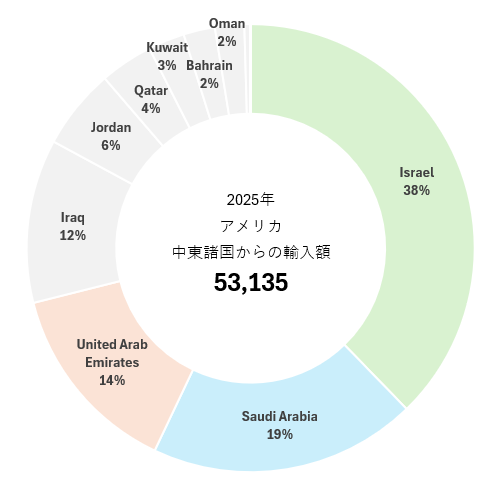 2025年におけるアメリカの中東諸国からの輸入額(531億ドル)を国別でみると、