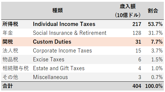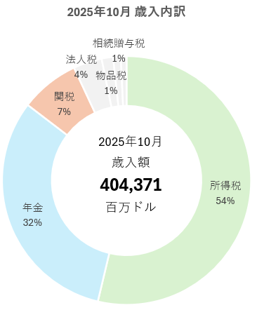 2025年10月のアメリカの歳入額(連邦政府)は4,044億ドル、歳出は6,887億ドル、収支は2,844億ドルの赤字であった。内訳をみると所得税(Individual Income Taxes)が2,170億ドル(53.7%)、年金(Social Insurance & Retirement)が1,280億ドル(31.7%)と、この2つで全体の85.4%を占めている。関税は310億ドル(7.7%)であった。