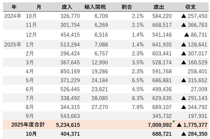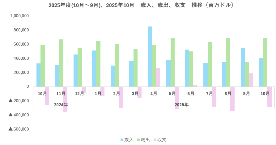 2025年度(2024年10月~2025年9月)合計でみると、歳入が5兆2,346億ドル、歳出が7兆0,100億ドル、収支が1兆7,754億ドルの巨額の赤字。