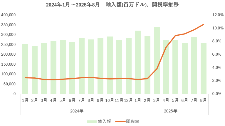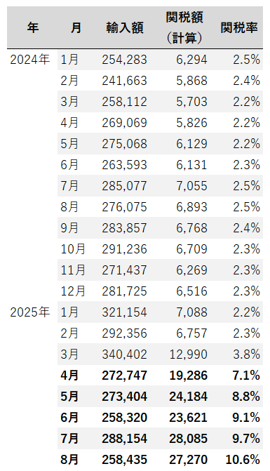 一方、輸入総額と関税額(計算上)と関税率の推移をみてみると、相互関税が発動した2025年4月以降、関税率が、それまでの約2%から、一気に8%を超える水準に跳ね上がっている。輸入総額は、関税の増加もあり、減少傾向にある。
