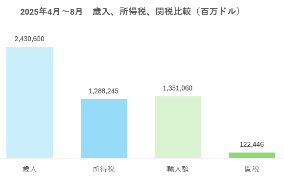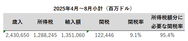 所得税を関税で代替できるかという点では、現実的ではなく、関税額が大幅に増加した2025年4月以降、8月までの小計でみてみると(輸入データは、連邦政府閉鎖の影響で8月分までしか公開されていない)、歳入が2兆4,307億ドル、所得税が1兆2,882億ドル(2025年10月の割合53%を適用)、輸入総額が1兆3,511億ドル、関税額(計算上)が1,224億ドル(歳入額の5%)。関税額は所得税の約10分の1に過ぎず、所得税と輸入総額がほぼ等しい水準。所得税を関税で代替しようとすると、単純に輸入総額と同じ額を関税として徴収する必要があり、もし、輸入総額が減少しないと想定すると、単純に95%~100%の関税率を掛ける必要がある。