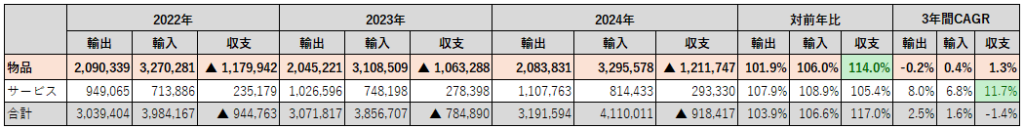 2022年~2024年、アメリカの輸出入、貿易収支(物品【モノ】、サービスの割合)
