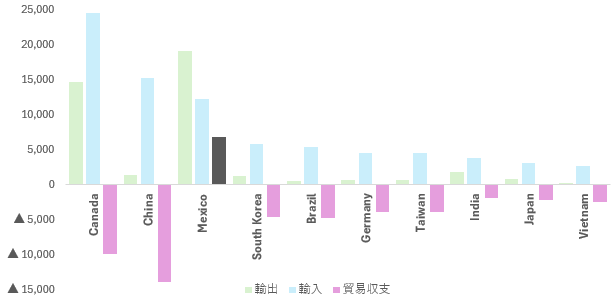 輸出先で一番はメキシコの192億ドルで、輸入上位10ケ国中唯一、貿易収支が黒字(プラス69億ドル)となっている。中国とは一方的に輸入額が大きいが、カナダ、メキシコとは、輸出額、輸入額双方とも大きく、これらに関税を掛けると、互いにたたき合いとなり、双方が傷つくだけとも思える。