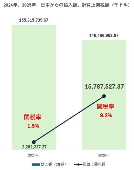 • 2025年通年のアメリカの日本からの計算上の関税額は157.9億ドル(計算上関税率9.2%)で、2024年の22.8億ドル(計算上関税率1.5%)から135.1億ドル(計算上関税率では7.7%)大幅に増加