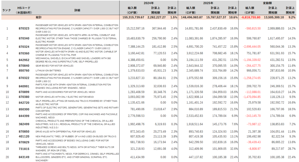 HSコード6桁での2024年、2025年 アメリカの日本からの輸入額(千ドル)、計算上関税率(%)及び変動の状況
