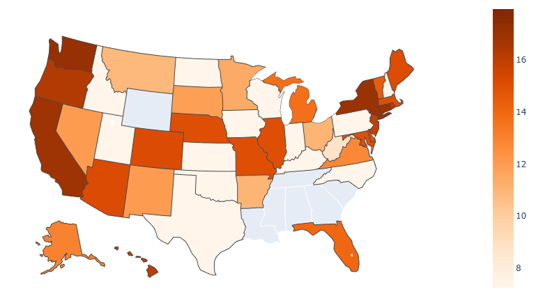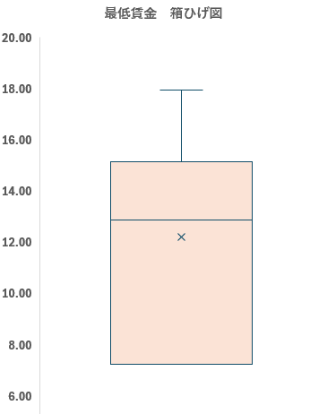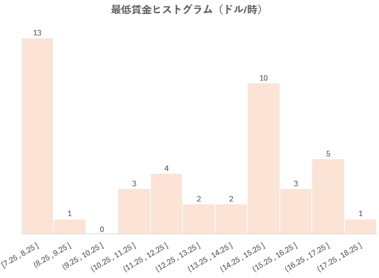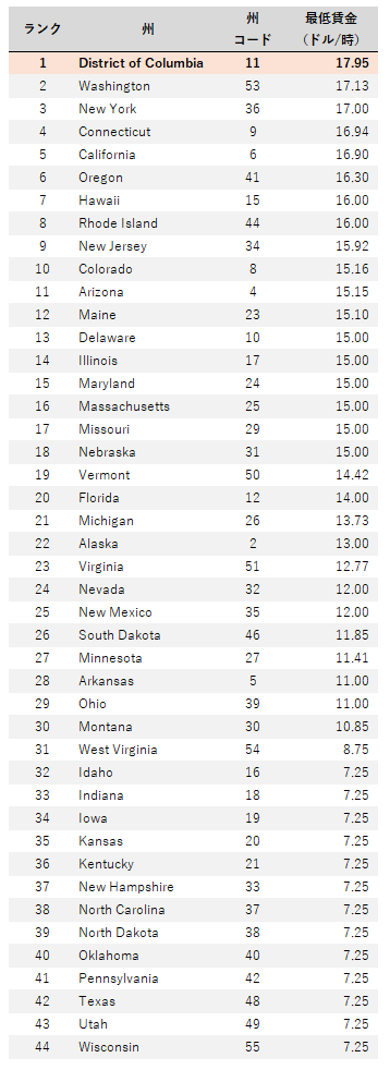 公表されている44州のうち、一番最低賃金が高いのはワシントンDCの17.95ドル/時で、次いで、ワシントン州の17.13ドル/時、そして、ニューヨーク州の17.00ドル/時と続く。一番安いのは7.25ドル/時で、アイダホ州以下、ウィスコンシン州まで13州あり、数としては一番多い。平均は12.20ドル/時、中央値は12.89ドル/時。