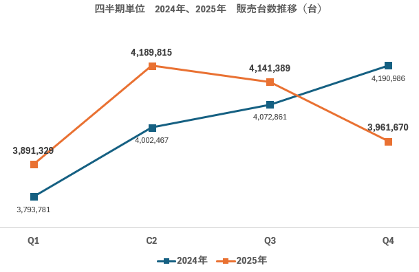 2024年、2025年の販売台数を四半期毎にみると、2025年はQ1~Q3は2024年を上回っているが、Q4に大きく減少し、2024年Q4販売台数を下回っている。