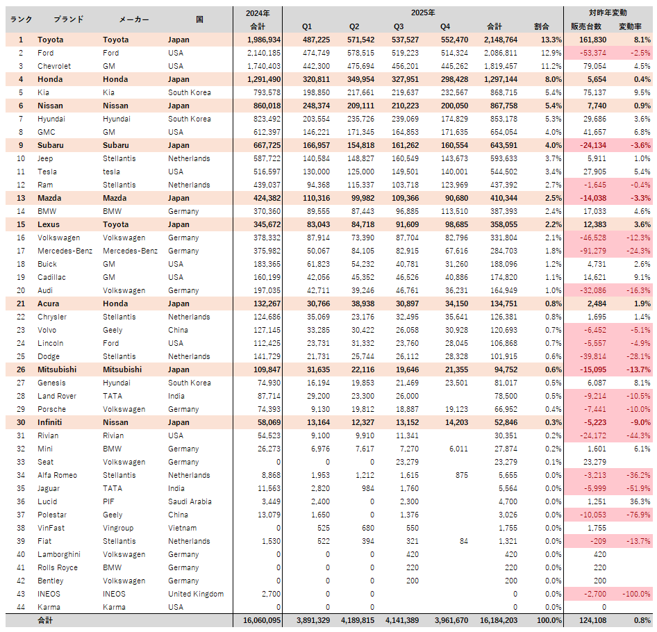 2025年Q4および通年のアメリカにおける自動車販売台数の状況をみてみた。データは、goodcarbadcarサイトからの引用。2025年Q1、Q2の状況は【アメリカ ブランド別自動車販売台数 2025年Q1、Q2】、2025年Q3の状況は【アメリカ ブランド別自動車販売台数 2025年Q3】を参照のこと(*データソースが違うので、分類方法など異なる点があることに注意)