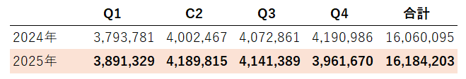 | 合計 | 3,793,781 | 4,002,467 | 4,072,861 | 4,190,986 | 16,060,095 | 3,891,329 | 4,189,815 | 4,141,389 | 3,961,670 | 16,184,203 | 100.0% | 124,108 | 0.8% |