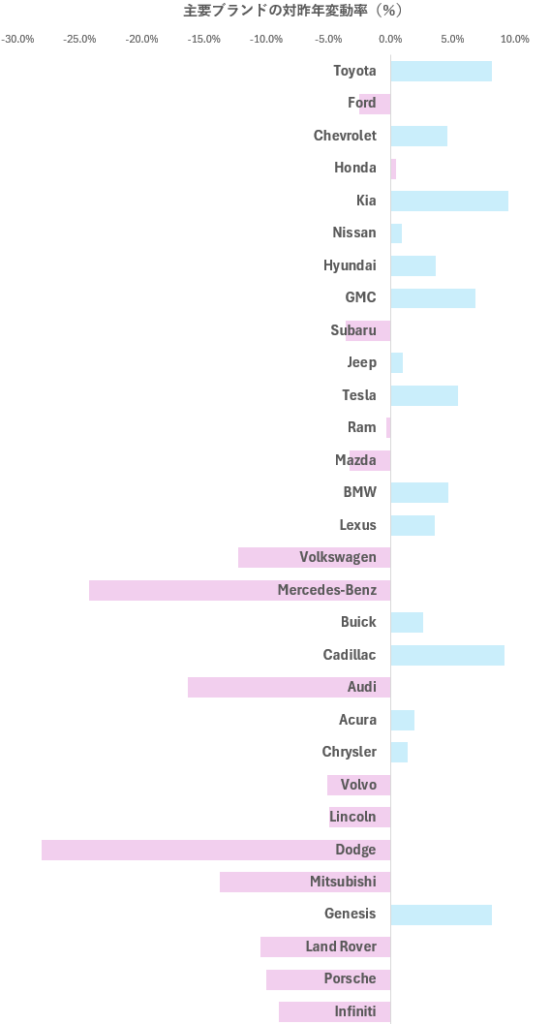 2025年通年販売台数(1,618万台)をブランド毎に、対昨年販売台数変動でみてみると、