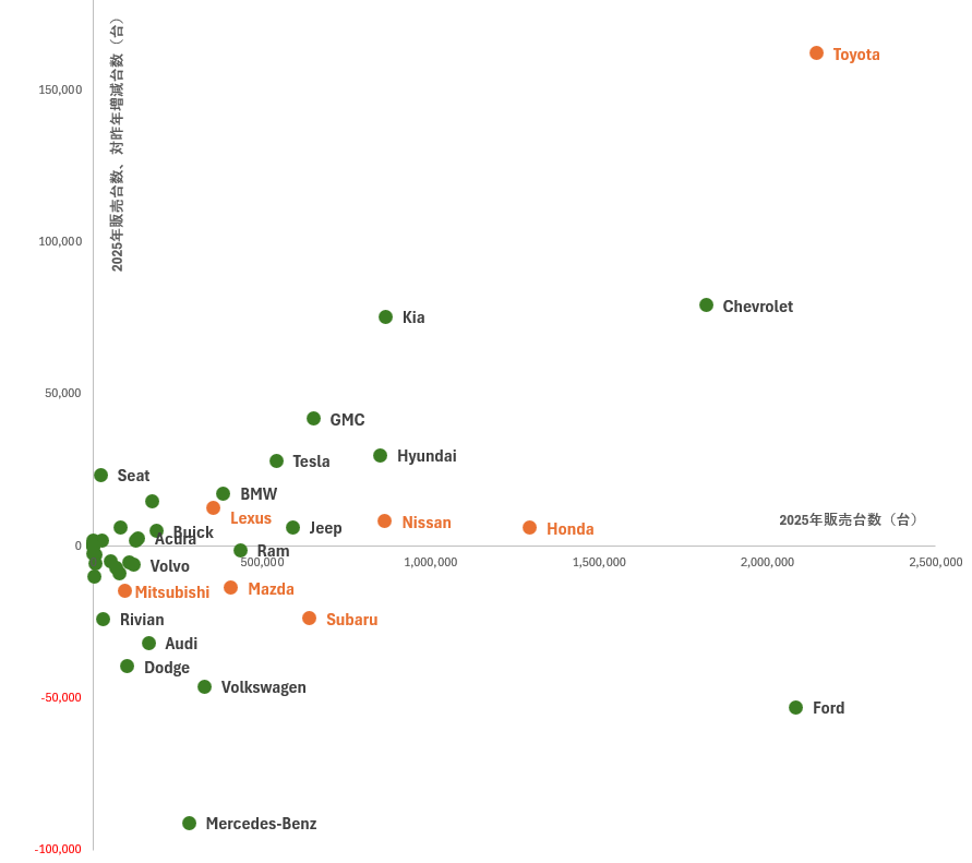 横軸に2025年販売台数(台)、縦軸に2025年販売台数、対昨年増減台数(台)をとった散布図でみると、