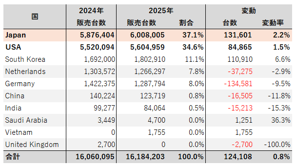 2025年通年販売台数(1,618万台)を国毎にみてみると、
