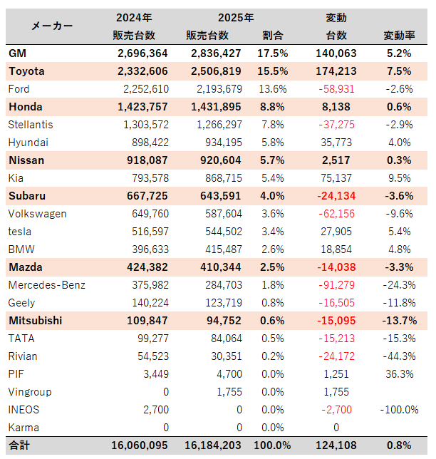 2024年、2025年 アメリカ 自動車販売台数 メーカー毎(台)