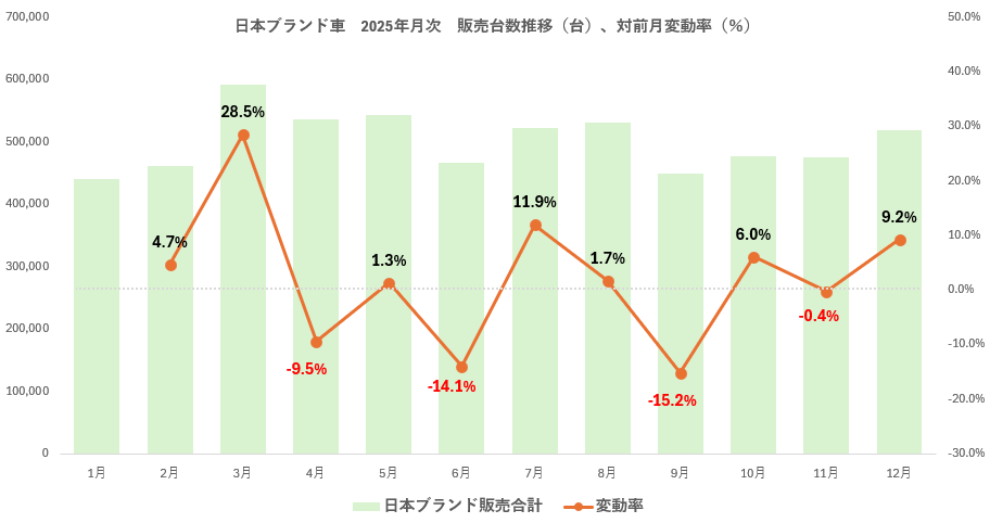 2025年通年における日本ブランド車販売台数(601万台)の月次平均販売台数は50万台、最大は59万台、最小は44万台なので、月次で15万台の差がでている(標準偏差4.4万台)