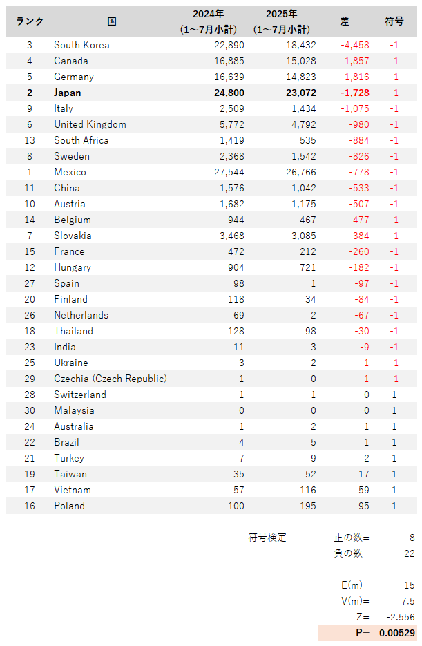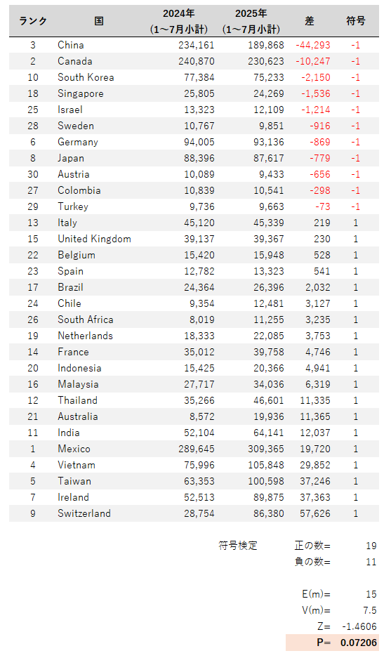 自動車輸入額 2024年1月~7月小計と2025年1月~7月小計の差の符号検定