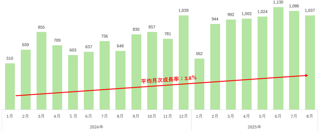 2025年8月の日本からの茶(HSコード:0902)の輸出量は1,037トン/月(輸出額5,872百万円)で、7月の1,086トンから4.5%減少している。ただ、2025年4月以降、1,000トン/月を超える量が続いており、2024年通年平均の740トン/月から大幅に増加している。事実、2024年1月から2025年8月までの月次平均成長率は3.8%となっている。