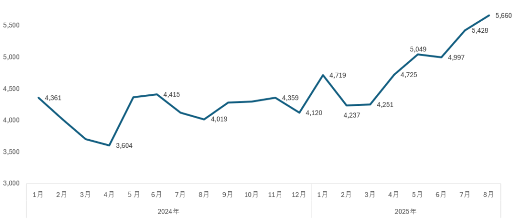 一方、輸出額でみると、2025年5月以降、5,000百万円/月を超えており、2024年通年の平均月次輸出額が3,057百万円であったことをみると、大幅に増加している。さらに、額の増加率が量の増加率を上回っていることから輸出単価(円/kg)は、2024年通年平均の4,139円/kgから、2025年8月には5,660円/kgと1,500円/kg上昇している。