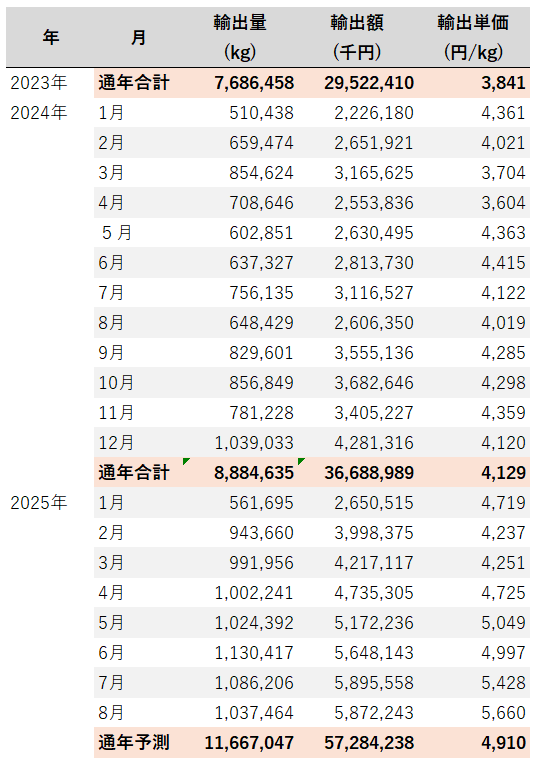 2025年末までの予測として、9月~12月を8月までの平均としてみると、通年輸出量予測として、11,667トンとなり、2024年の8,885トンから31.3%と大きく増加する可能性がある。