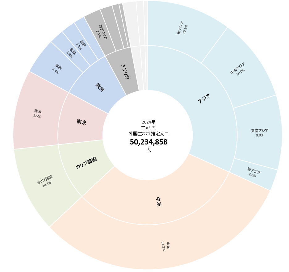 アメリカの2024年の外国生まれは(推定5,0235万人)を地域別にみると、