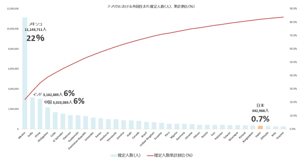 - メキシコ生まれが1,114万人(22.2%)で圧倒的に多い