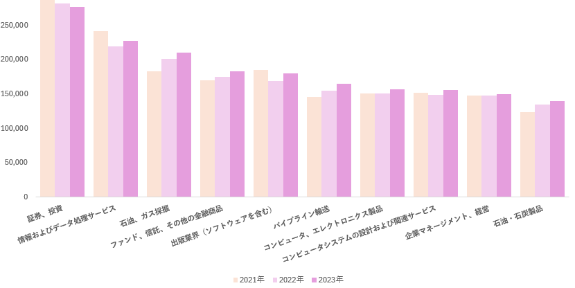 職種別に賃金を高い順で見ると、やはり証券・投資が277,235ドルでトップ、ついで情報およびデータ処理サービスの227,905ドル、そして石油・ガス採掘の210,864ドルと続く。